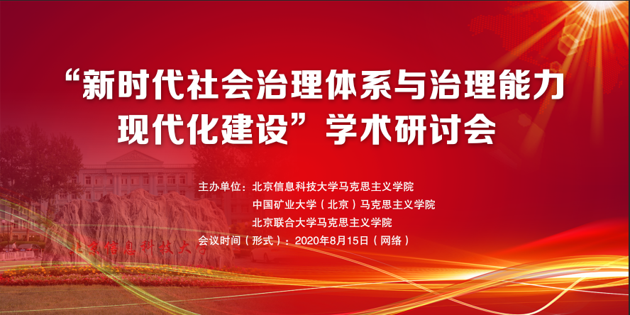 8月15日,我院联合北京信息科技大学马克思主义学院和北京联合大学马克思主义学院举办的“新时代社会治理体系与治理能力现代化建设”学术研讨会在线上顺利召开。来自北京信息科技大学、北京联合大学、重庆邮电大学、中国矿业大学(北京)、《北京教育(德育版)》杂志社、《北京科技大学学报(社会科学版)》杂志社以及其他高校的领导、专家学者和师生约200人出席了此次研讨会。
