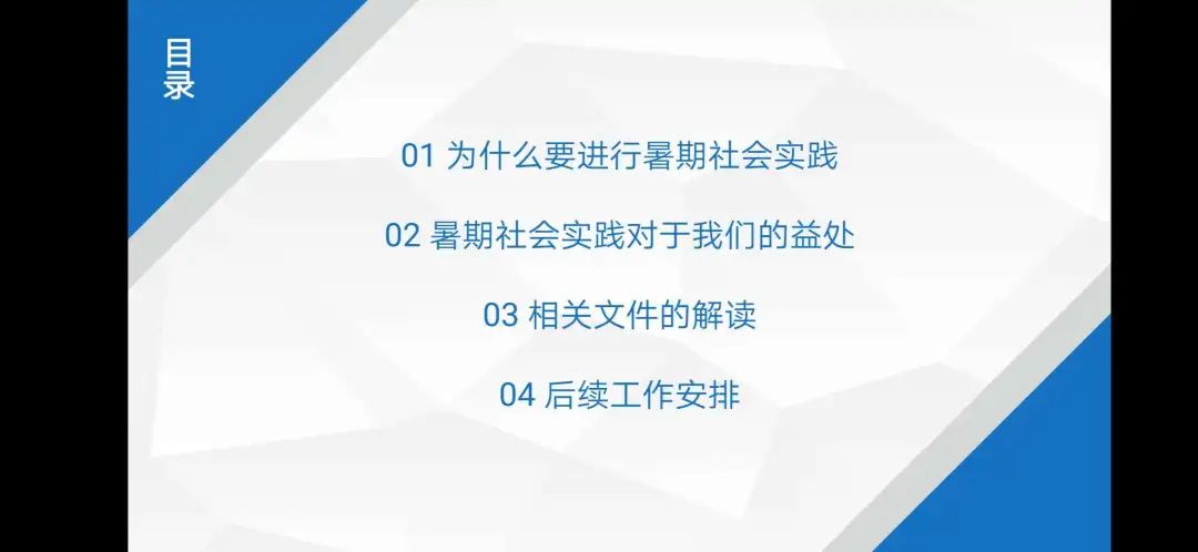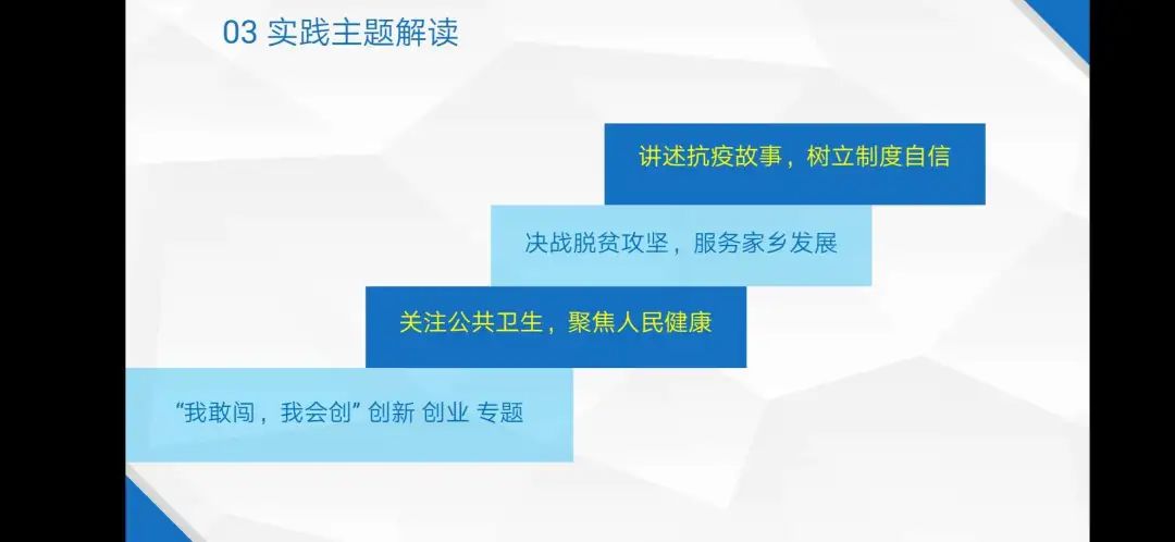 随后,院团委学生副书记张颖欣同学分别从暑期社会实践的开展、暑期社会实践价值、文件解读、工作安排四个方面就本年度社会实践活动做了详细介绍,重点围绕今年暑期社会实践的四个主题进行解读, 分别从立项、培训、安全、宣传等工作进行布置,并现场回答同学们的提问。