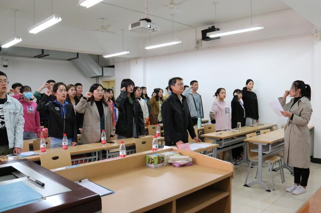 最后,全体学生干部起立,在分团委副书记李岚领誓下宣读了《学生干部自律公约》,并合唱共青团团歌,在同学们声音洪亮、饱含热情的誓言与歌声中,我院2020年度第一次团学干部会议圆满结束。