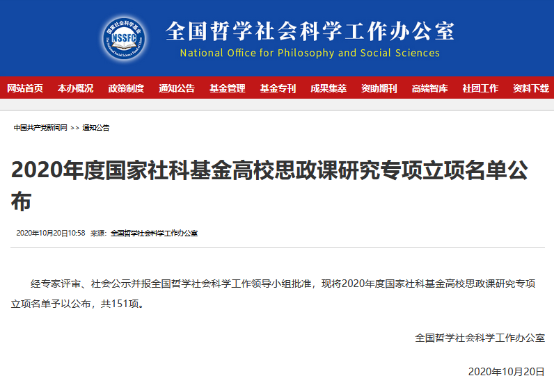 近日,全国哲学社会科学规划办公室正式公布2020年国家社科基金高校思政课研究专项项目立项名单,我院教师盖逸馨副教授申报《新时代增强高校思政课对社会思潮的引领力研究》(项目批准号:20VSZ024)获得批准立项,为学校首次获批高校思政课研究专项项目,2020年度全国仅获批立项151项。