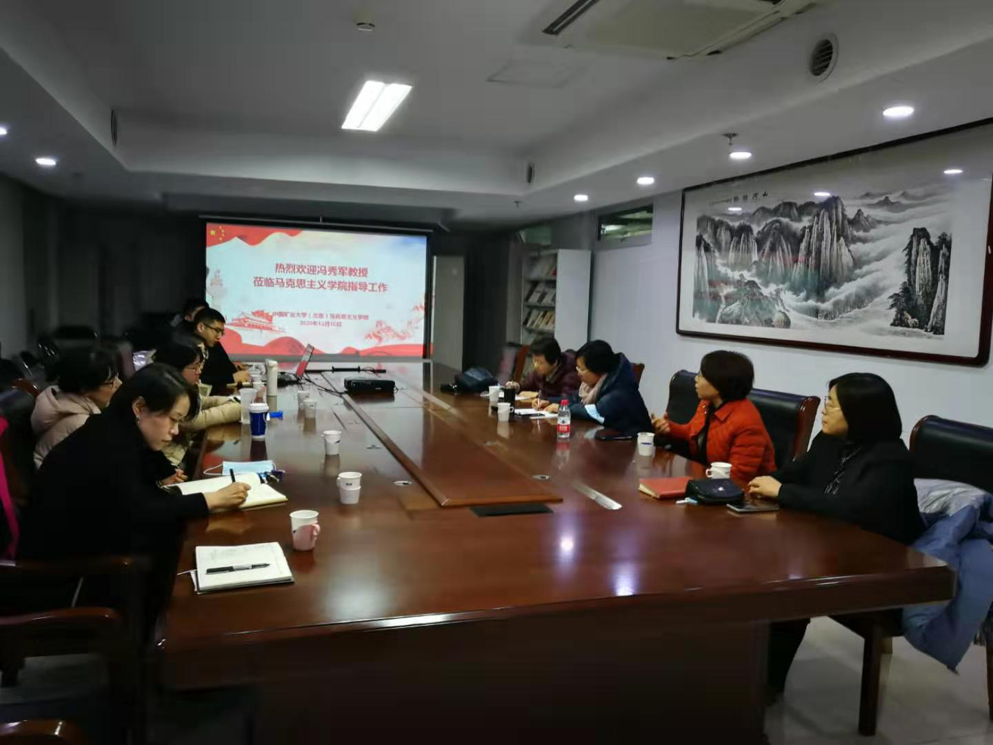 2020年12月10日下午,中央财经大学马克思主义学院院长冯秀军教授莅临我院做讲座,并在逸夫楼1217会议室与我院部分教师进行座谈。马克思主义学院李妍院长、盖逸馨副院长及部分老师参加以上活动。