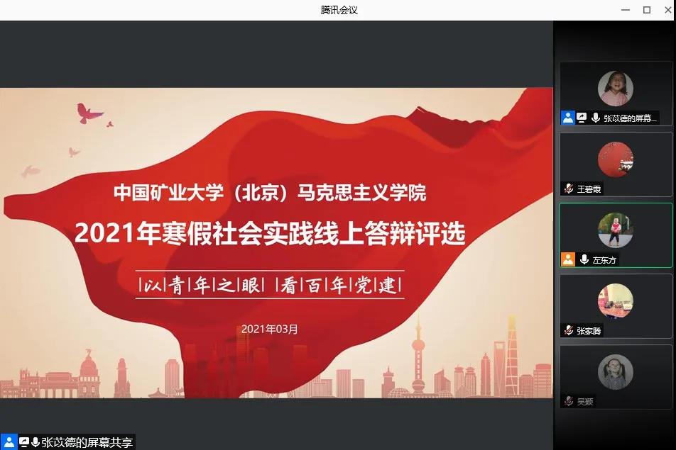 为引导我院学生了解世情国情、社情民情,在服务社会中厚植家国情怀,在实践锻炼中受教育、长才干、作贡献。2021年3月9日,中国矿业大学(北京)马克思主义学院以腾讯会议的形式召开2021年寒假社会实践总结答辩会。学院分团委书记左东方、研究生班主任朱彤、谢世良、杨磊作为评审嘉宾出席此次答辩会。会议由马克思主义学院分团委副书记张苡德主持。