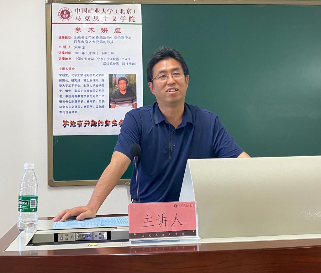 6月18日下午,北京大学马克思主义学院副院长、博士生导师宋朝龙研究员应邀在我校沙河校区教2-403作了《金融资本帝国晚期政治生态的裂变与百年未有之大变局的形成》的主题讲座。北京大学、北京信息科技大学等兄弟院校及我校师生代表100余人参加了线上线下讲座与交流。
