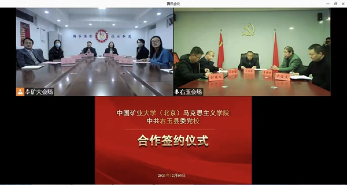 为深入贯彻落实党的十九届六中全会精神,充分发挥红色资源优势,12月3日,中国矿业大学(北京)马克思主义学院与中共右玉县委党校举行合作签约仪式。右玉县委常委、组织部部长、党校校长王国梁,右玉县委党校常务副校长李晓彬,右玉县委组织部副部长、县委编办主任刘金宝,右玉县委组织部副部长尹俊杰,右玉县委人才服务中心副主任刘旺久出席会议。马克思主义学院全体班子成员,教研室主任和教师代表参加会议。仪式由马克思主义学院党总支书记李建伟主持。