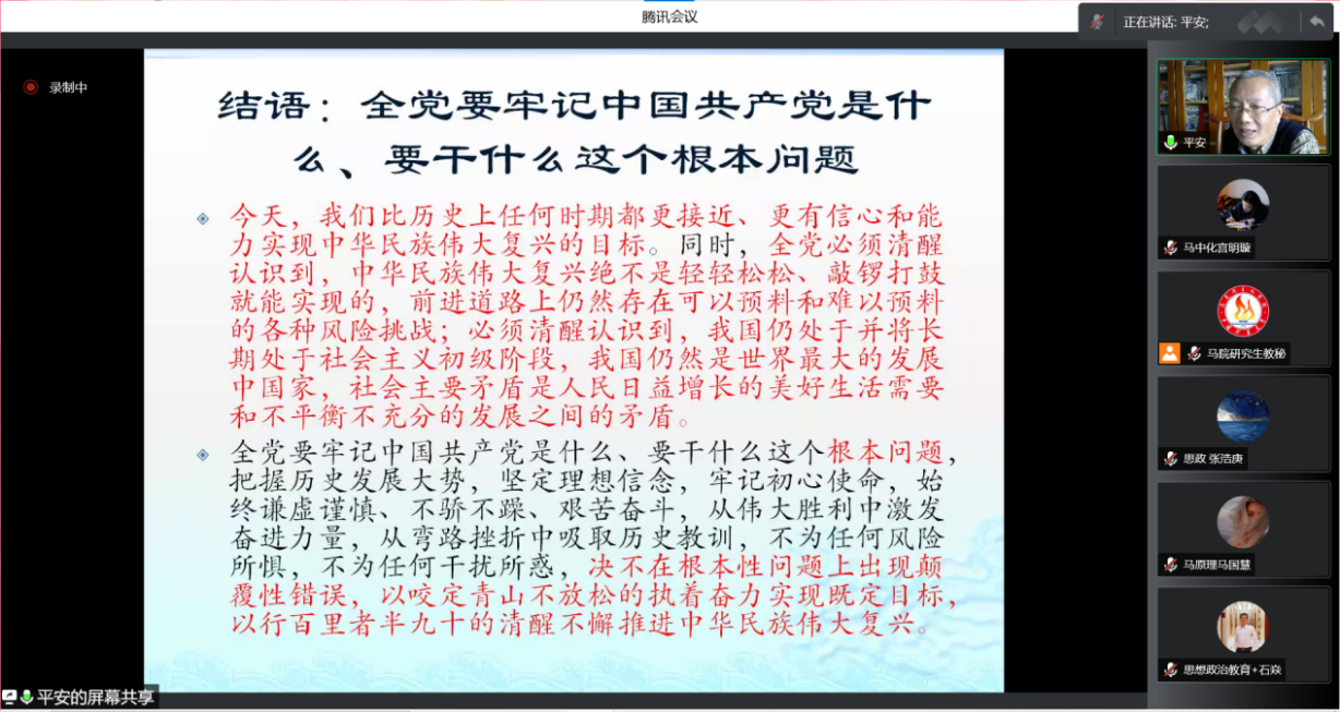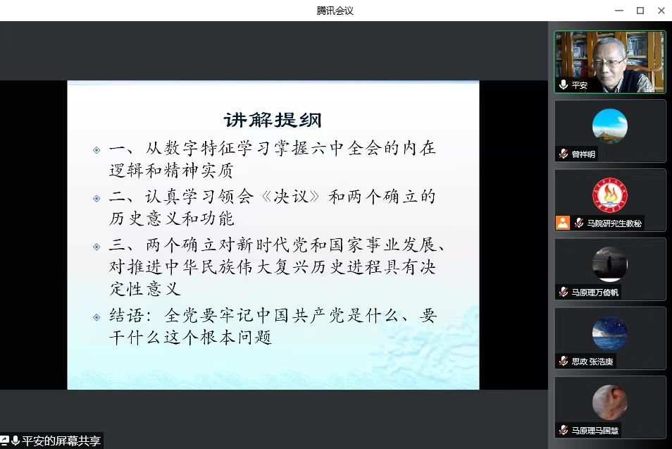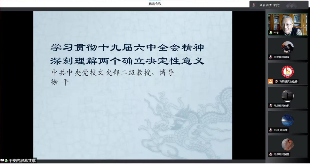 百年征程波澜壮阔,百年奋斗成就辉煌。为了深刻把握党百年奋斗的重大成就,深刻学习贯彻十九届六中全会精神,进一步提升我院马克思主义理论学科建设和高层次人才培养水平,丰富学生理论视野,4月20日下午,中央党校文史部二级教授、博士生导师徐平以腾讯会议的形式为我院师生作《学习贯彻十九届六中全会精神深刻理解两个确立决定性意义》的主题讲座。