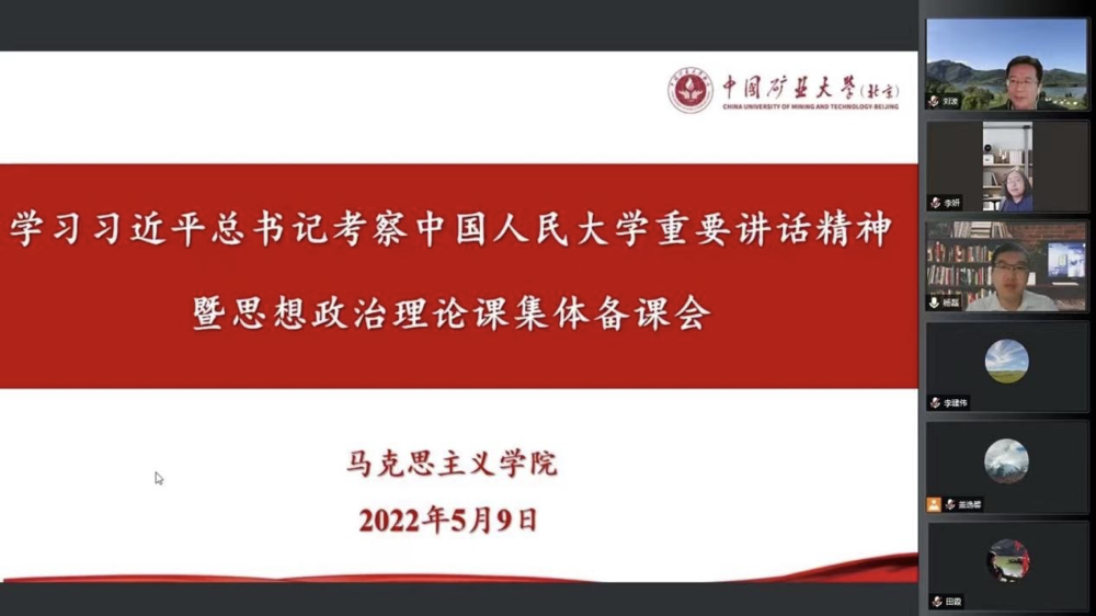 会上,刘波传达5月4日校党委理论学习中心组专题学习习近平总书记在中国人民大学考察时重要讲话精神的会议内容,指出习近平总书记重要讲话立意高远、视野宏大,思想深刻、内涵丰富,精辟阐述实现民族复兴历史伟业赋予高校的战略使命。4月29日,徐孝民书记、葛世荣校长讲授“疫情防控大思政课”,肯定我校广大教师在疫情防控期间为提升线上教学质量付出的辛勤努力。刘波结合学校思想政治理论课建设要求提出三点希望并与大家共勉。一是坚持为党育人,进一步夯实思政课政治属性,结合国情、党情、社情、民情讲好思政课,促进思政课程与课程思政同频共振,始终坚定社会主义大学的政治立场和办学方向。二是赓续红色基因,进一步提升教学改革创新内容,落实学校基层教学组织建设实施意见,加强基层教学组织教学研究,深入挖掘各门课程蕴含的红色资源,从百年精神谱系中汲取奋进新征程精神力量。三是践行学为人师,进一步提升课堂教学育人成效,发扬严谨治学、甘为人梯精神,把思政课的道理讲深、讲透、讲活,切实肩负起教书育人光荣使命。马克思主义学院要全面落实学校党委决策部署,坚持高站位谋划、高标准要求、高质量落实,以习近平新时代中国特色社会主义思想铸魂育人,立足实际推进新文科建设创新发展,不断提升马克思主义学院建设水平,助力学校“十四五”期间双一流建设走深走实,以实际行动和优异成绩迎接党的二十大胜利召开。