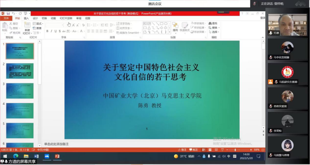 5月20日下午,由学院组织的《关于坚定文化自信的若干思考》主题讲座通过腾讯会议的形式成功举办,此次讲座特邀我院兼职博导陈勇教授主讲。
