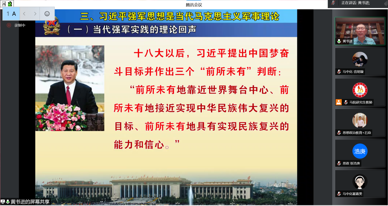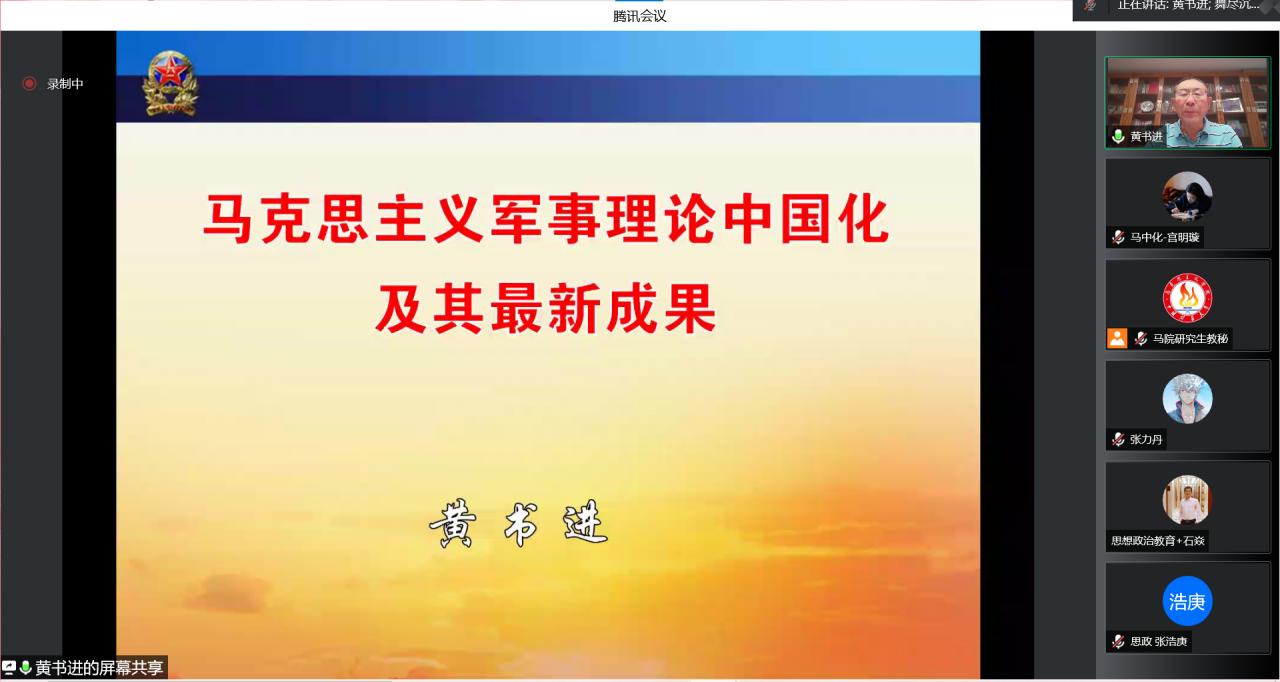 5月31日下午,由学院组织的《马克思主义军事理论中国化及其最新成果》主题讲座通过腾讯会议的形式成功举办,此次讲座特邀我院特聘教授、国防大学原马克思主义教研部副主任、海军少将、博导黄书进主讲。