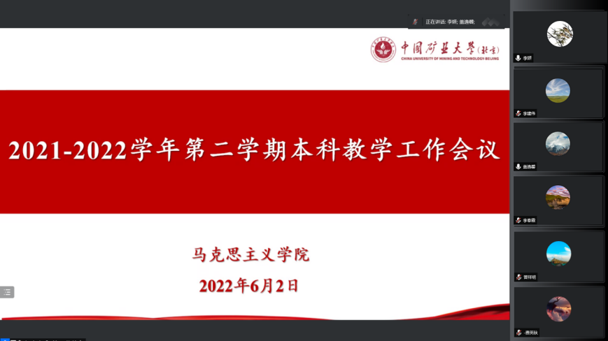 为进一步保障2022年春季学期本科教学工作平稳有序进行,提前谋划筹备秋季学期工作,6月2日,马克思主义学院组织召开本科教学工作会议,学院全体领导出席会议,教研室主任参加会议。会议由副院长盖逸馨主持。