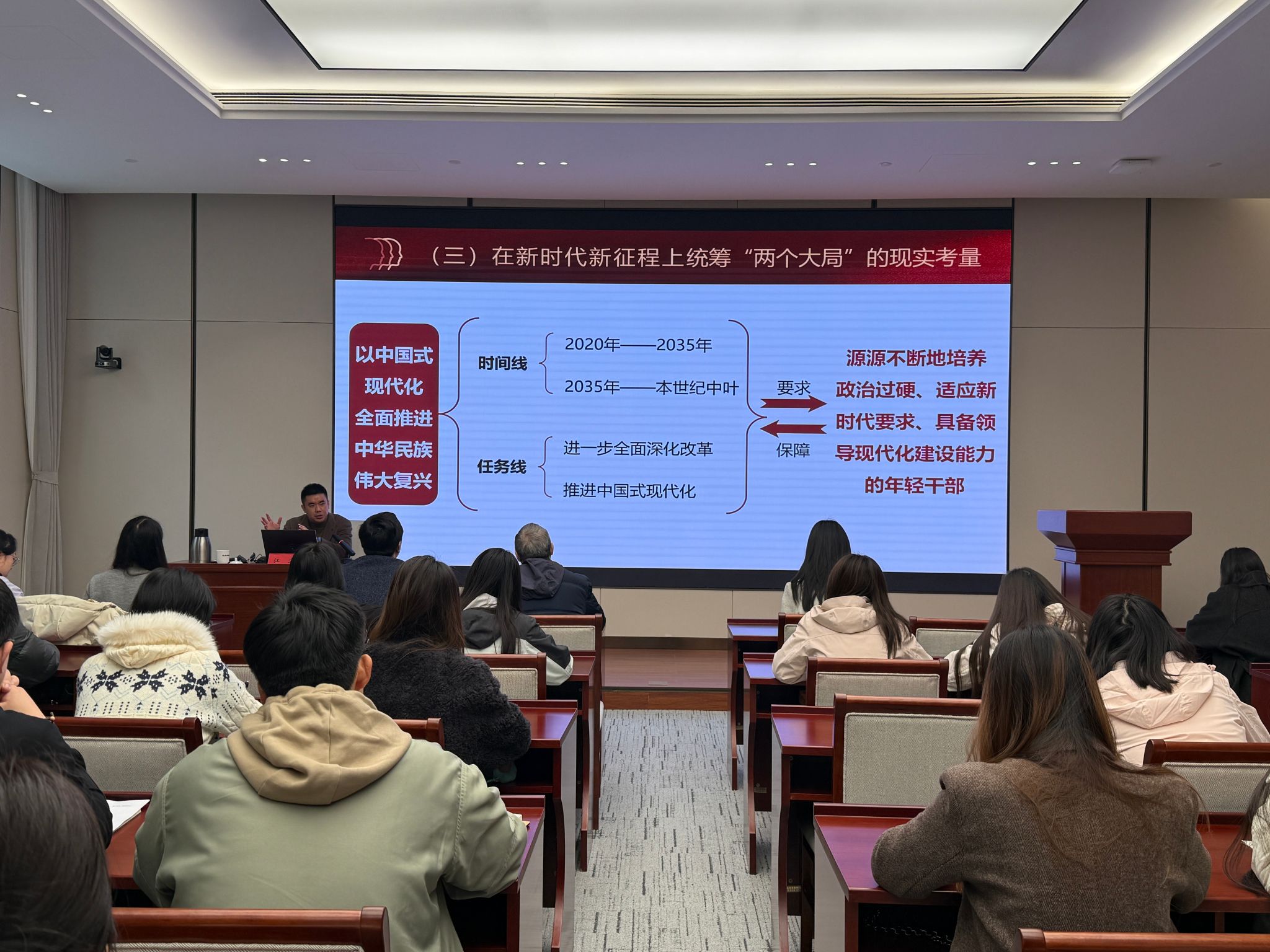 本次培训聚焦主题,内容扎实,形式多样,包含专题学习与现场教学两大环节。在专题学习环节,北京市委党校(北京行政学院)江文老师以《习近平总书记关于年轻干部成长的重要论述》为题作专题辅导报告。结合大量鲜活案例与自身研究心得,系统阐述了总书记对年轻一代成长成才的殷切期望、战略考量和根本要求。报告既有深厚的理论阐释,又有贴近青年实际的实践指导,为师生深刻领悟新时代青年肩负的历史使命与责任担当提供了重要启发。在现场教学环节,师生们走进“京华实践”主题教室,通过多媒体互动展示、实景案例讲解和沉浸式体验学习,全面了解习近平新时代中国特色社会主义思想在京华大地的生动实践,在“看、听、悟、行”的全过程中深刻领悟党的创新理论的真理力量和实践伟力。