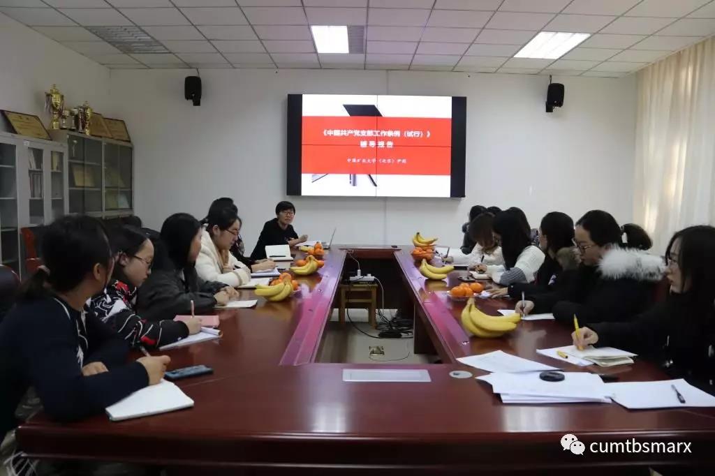 会议开始,崔艳娜老师先向与会成员介绍参会的老师。随后尹娟老师带领大家就《条例》的具体内容进行详细解读并指出,《条例》坚持以习近平新时代中国特色社会主义思想为指导,为党支部的建设提供基本遵循,各党支部应该切实抓好《条例》的学习宣传贯彻工作。尹老师强调,推进党支部建设,一定要坚决拥护党的领导,认真担负起党支部教育党员、管理党员、监督党员和组织群众、宣传群众、凝聚群众、服务群众的重要职责。作为学生党支部,我们更要树牢“四个意识”,坚定“四个自信”。充分发挥党员的先锋模范作用,将支部工作与专业特色相结合,打造支部特色。