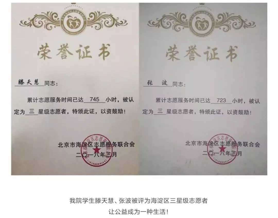 15级思政专业滕天慧同学在校期间积极参加各种志愿服务,志愿时长高达745小时。2017年3月她积极参加北京志愿服务发展研究会举办的2017年《论志愿》学术大讲堂活动。6月—10月期间她不仅参加北京市志愿北京小微项目“忆往昔 助老励生”志愿服务工作并承担管理工作一职,还参加了志愿北京小微项目“人物、风物、事物”志愿文化研究工作。在校期间她积极组织并参加我院“天使之家”爱心活动,每周到天使之家福利院进行志愿服务活动。她的勇于承担和乐于奉献的精神赢得了学院师生的一致好评,为她点赞。