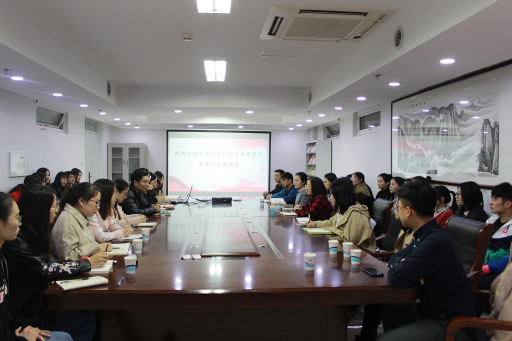 为进一步深入学习贯彻习近平总书记在学校思想政治理论课教师座谈会上的重要讲话精神,同时深化两校马克思主义学院“1+1”共建,3月29日下午,北京信息科技大学马克思主义学院硕士研究生,在党总支副书记于洋带领下来我院进行交流研讨。座谈会在逸夫楼1217举行,我院院长助理卢刚及部分硕士研究生参加座谈。