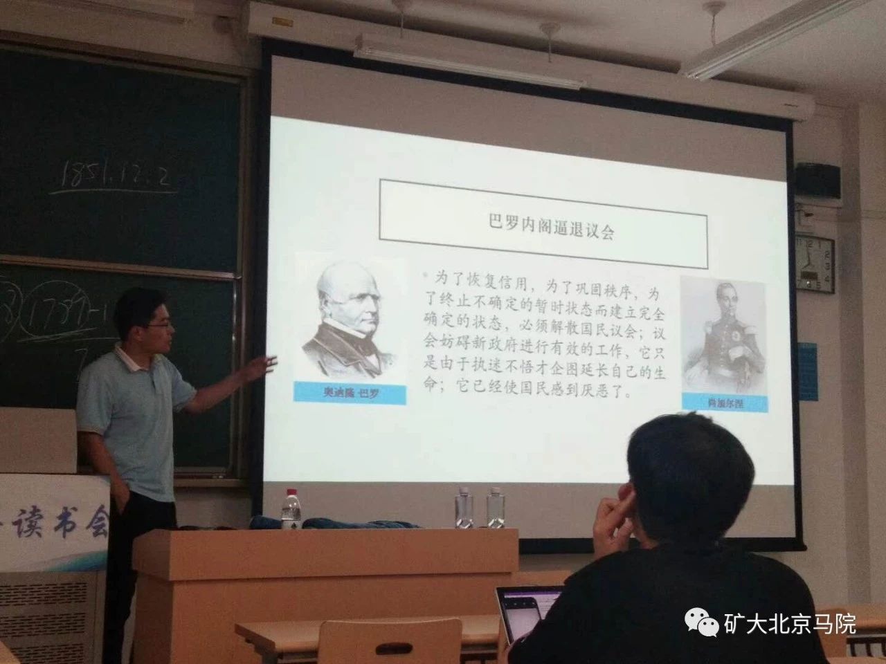 4月17日晚,马克思主义青年读书会在沙河校区2教601教室,组织《路易·波拿巴的雾月十八日》原著研读活动。马克思主义学院卢刚老师担任主讲,沙河校区读书会成员参加活动。