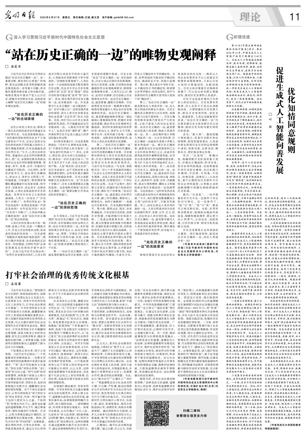 治国施行德法兼济,传承安邦智慧。中华优秀传统文化蕴含着德法共治的治理哲学,其核心要义在于,道德教化滋养社会共同价值,涵育向善风尚;法律制度则明确行为边界,树立刚性权威。二者相辅相成,共同筑牢国家治理基石。纵观历史演进,从汉代确立“引礼入法、礼法结合”的立法原则,到《唐律疏议》明确“德礼为政教之本,刑罚为政教之用”的治理宗旨,这种治理模式通过道德教化提升社会自律水平,通过法律规制和矫正失范行为,有效维系社会秩序与国家稳定。深入挖掘并创新发展德法共治理念,能够为推进国家治理体系和治理能力现代化注入文化底蕴,彰显“中国之治”的独特优势与强大生命力。